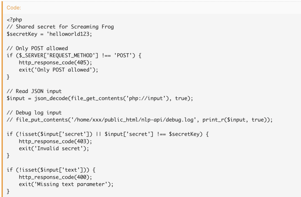 This experience has really opened my eyes to what else could be proxied and made accessible through Screaming Frog’s JavaScript snippets. It’s not just about NLP, you could apply this method to any API that needs authentication or sensitive keys. Think of translation APIs, classification tools, custom content classifiers, even OpenAI functions if you’re careful.