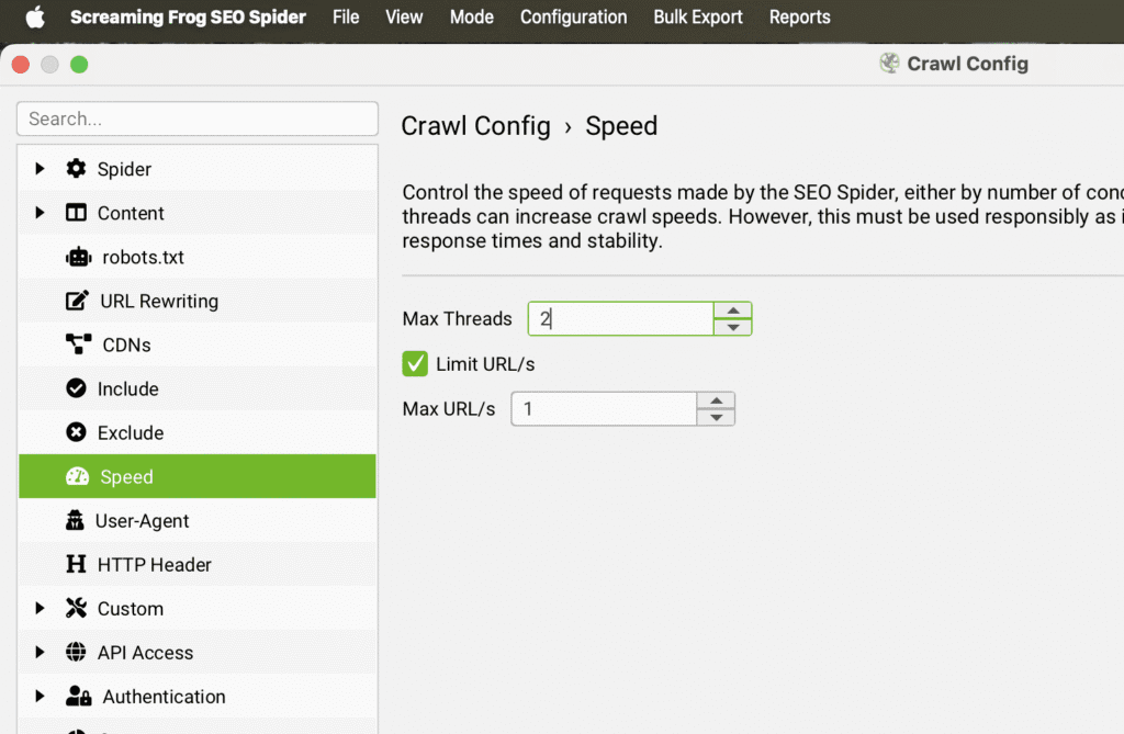 I strongly recommend slowing the crawl rate down. Head into Screaming Frog’s configuration and reduce the number of threads and crawl speed to something reasonable, especially if you’re working on shared hosting or using Google’s free tier. This will keep things stable and help avoid sporadic errors like 429s or 5xx responses from your proxy.