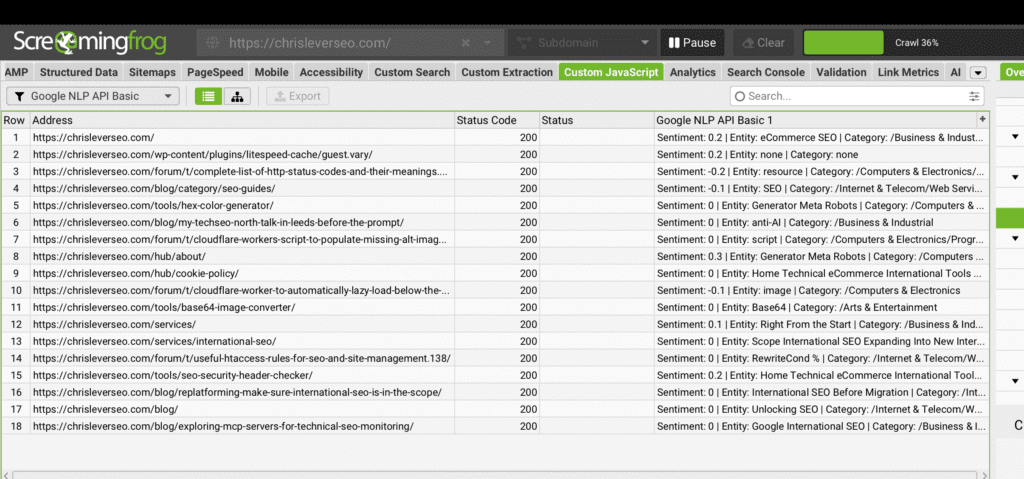Whether you’re technical or just want a plug-and-play way to bring Google’s NLP analysis into Screaming Frog, it’s all in that post.