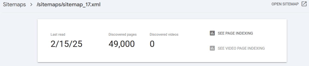 Google allows a single XML sitemap to contain up to 50,000 URLs or 50MB of uncompressed data. While that is useful in theory, in practice, large sitemaps can be difficult for Google to process. I have seen Search Console struggle with big sitemaps, sometimes failing to detect all URLs, even when they are well within Google’s limits.